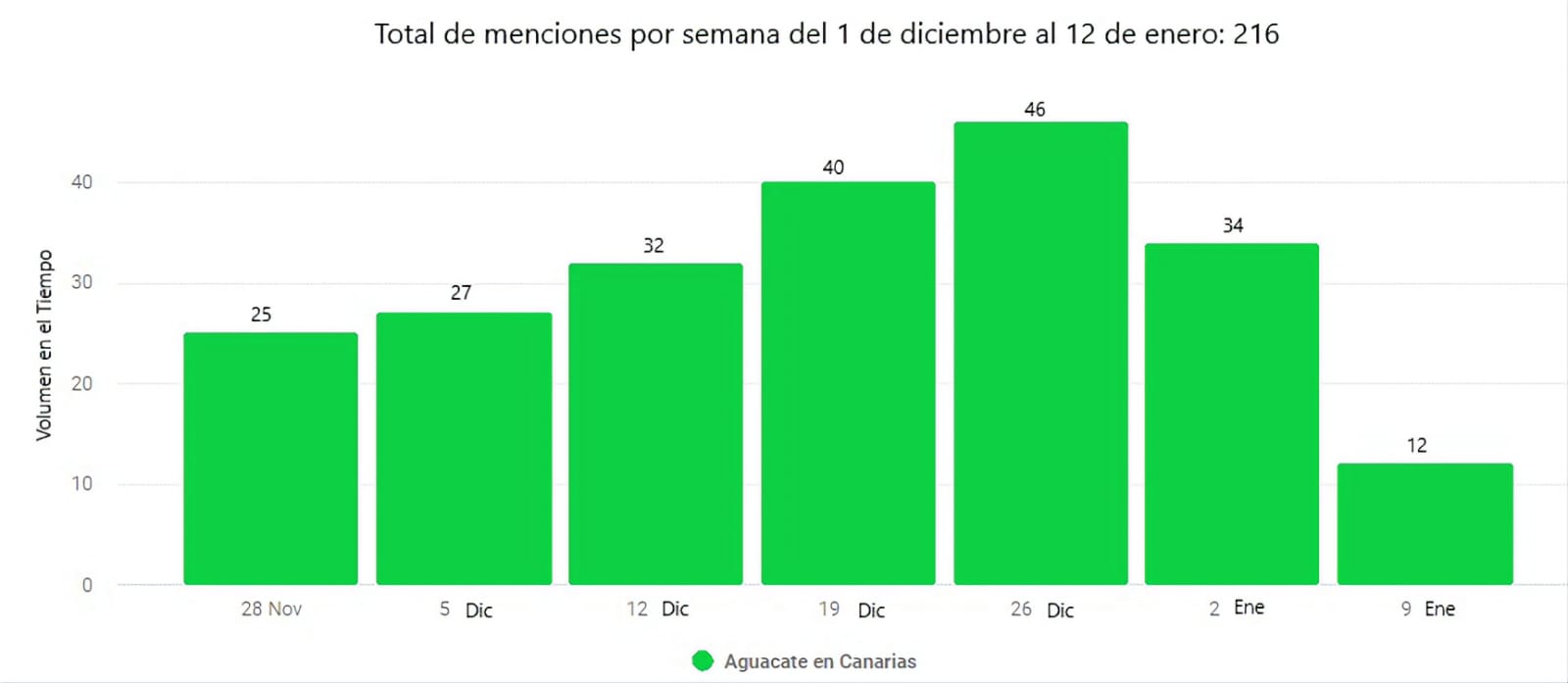 Un estudio realizado por MMI Analytics permite observar cómo fueron evolucionando las 216 menciones en redes sociales de 104 autores únicos, sobre el aguacate en Canarias, del 1 de diciembre 2022 al 12 de enero 2023 expresado en semanas: