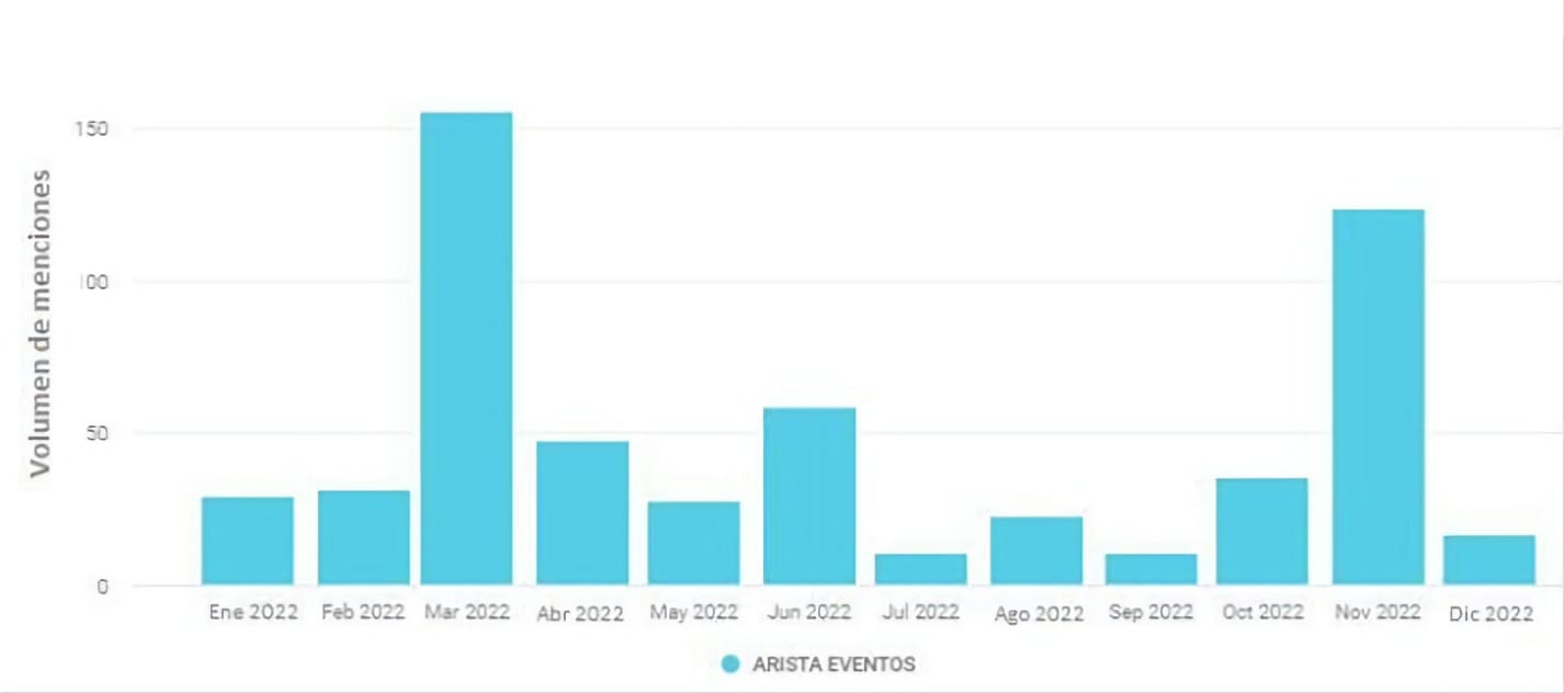 Un estudio realizado por MMI Analytics permite observar cómo fueron evolucionando las casi 600 menciones que hay sobre Arista Eventos de 171 autores desde enero 2022: