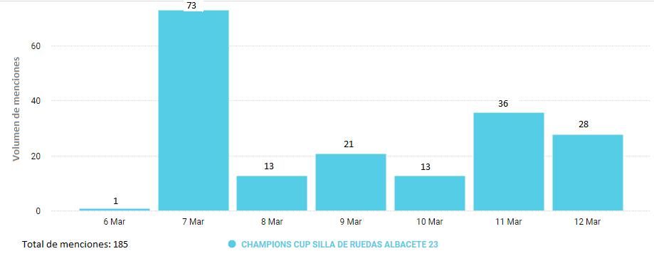 MMI Analytics realizó un informe que muestra un pico de menciones el día 7 de marzo con 73 referencias en redes debido a que se anunció en el Pabellón Lepanto, que Albacete iba a ser la sede de los cuartos de final de la Champions Cup.