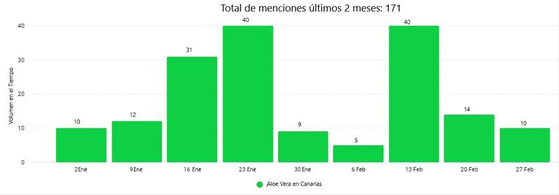 A su vez, el pico de menciones de la semana del 13 de febrero está relacionado con el trabajo del Instituto Tecnológico de Energías Renovables (ITER), dependiente del Cabildo de Tenerife y la Universidad de La Laguna, denominado Aloecan, que va a certificar la autenticidad y el origen geográfico de la producción de aloe vera procedente de Canarias. Se trata de un estudio de trazabilidad geográfica que evaluará el uso de isótopos naturales de estroncio y compuestos orgánicos específicos, existentes en las plantas de aloe, como potenciales “huellas dactilares” del aloe cultivado en Canarias y de sus productos derivados.