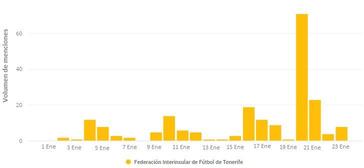 Según el estudio que se realizó en referencia a la Federación Interinsular de Fútbol de Tenerife desde el 1 de enero al 23 del corriente mes, reunió 210 menciones de 110 autores diferentes. El pico de menciones se puede visualizar el día 20 de enero con 71 alusiones debido a la presentación de una nueva imágen corporativa de la Federación.