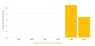 Se realizó un análisis en referencia a la Feria de Lectura y Escritura para Jóvenes Emprendedores, teniendo en cuenta desde el día 3 de febrero al 8 del mismo mes del 2023. En este intervalo de tiempo acumuló un total de 18 menciones en redes sociales de 17 autores diferentes que compartieron información sobre el tema.