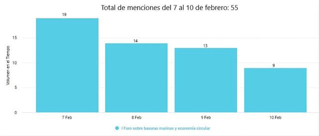 Gracias a las herramientas de monitoreo de medios de MMI Analytics se pueden mostrar cómo fueron evolucionando las 55 menciones en redes sociales de 30 autores únicos sobre el “I Foro Internacional sobre basuras marinas y economía circular en ambientes insulares – Marlice Islands 2023”, del 7 al 10 de febrero, días en los que se dio a conocer el mencionado evento: