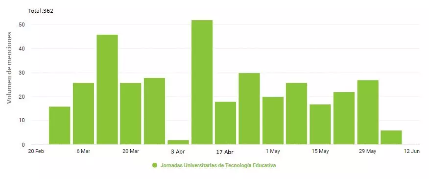 En el gráfico, cuya disposición está plasmada en semanas, se puede visualizar que el pico de menciones fue el día 10 de abril con 52 alusiones en redes. Esta cúspide de menciones se dio ya que ese día se anunció la extensión de inscripciones hasta el 30 de abril.