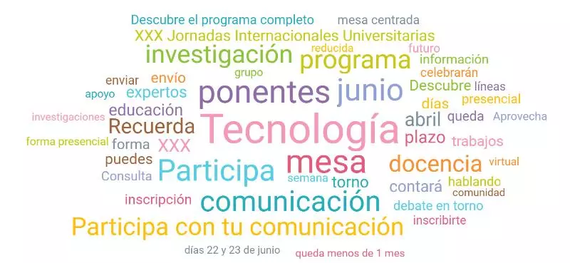 Gracias al monitoreo de medios realizado se puede determinar que los términos más utilizados al hablar de las Jornadas Internacionales Universitarias de Tecnología Educativa en redes sociales del 1 de marzo al 7 de junio fueron: