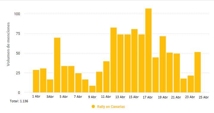 El pico de menciones más alto se dio el día 17 de abril, ya que se realizó la inscripción en una de las categorías de la competición. 30 vehículos fueron inscritos con éxito en la clase Rally2.