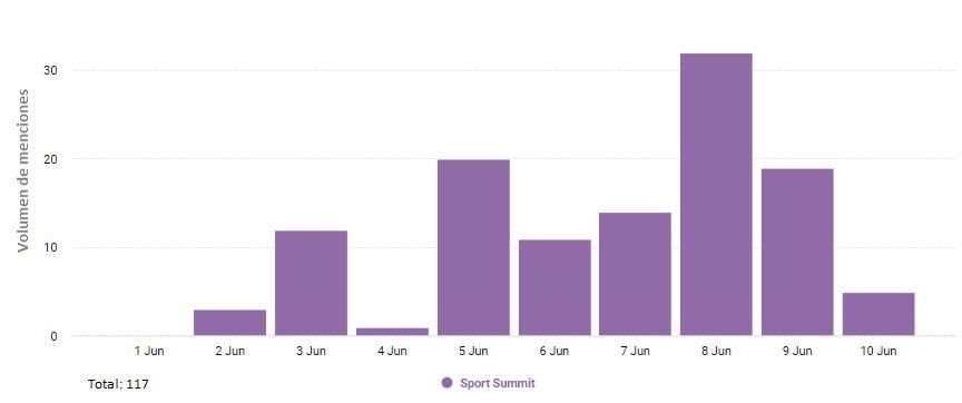 El estudio de medios realizado en referencia a la feria deportiva va del 1 de junio al 10 del mismo mes. En este período de tiempo Sport Summit acumuló un total de 117 menciones en redes sociales de 39 autores que compartieron información en sus cuentas.